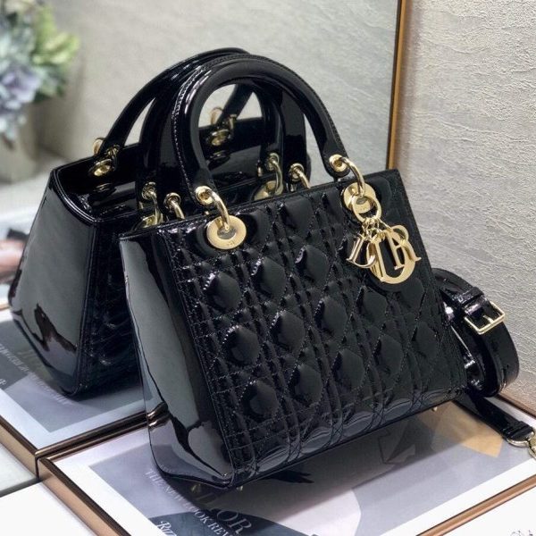 Dior M0565 Lady Dior Medium Tote Bag M950 Black Patent Cannage Calfskin