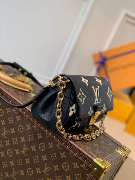 The Favorite is a fashionable baguette shoulder bag made from supple grained leather with an oversized embossed Monogram pattern. Feminine pleats bring a couture touch while the gold-color magnetic lock evokes Louis Vuitton’s heritage. A removable and adjustable strap enables short-shoulder carry or cross-body wear while a bold detachable gold-color chain allows more glamorous evening use.