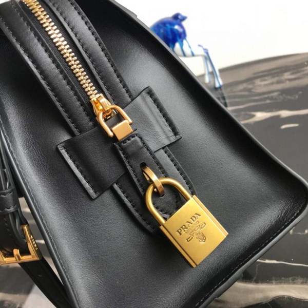 A Prada tote bag crafted in calfskin leather with a logo lined interior and gold-tone hardware. This Prada tote bag features a main zip pocket, an interior zip pocket and 3 interior pockets; two rolled leather handles and a detachable/adjustable leather shoulder strap. Dimensions